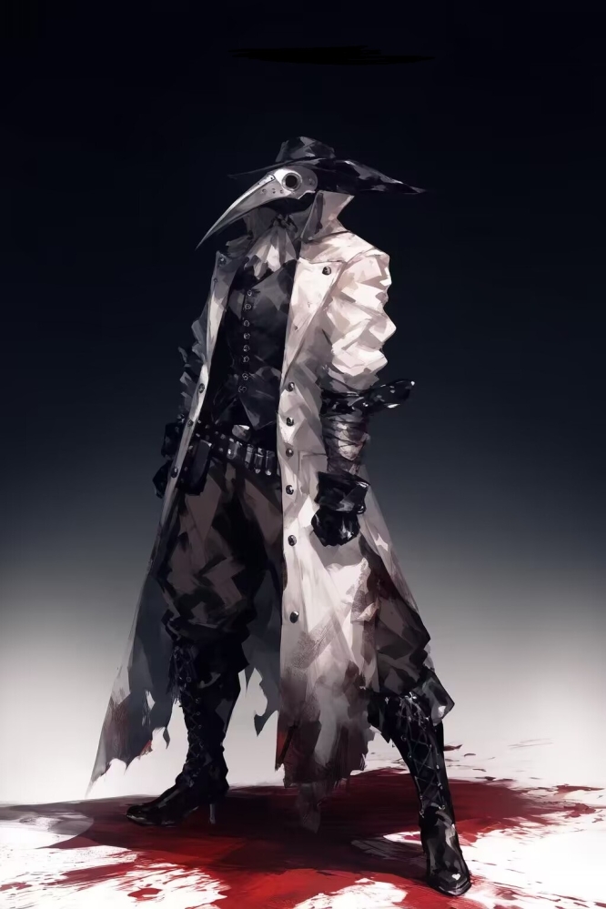 眼睛以上的部位是普通的白色面具露出一双金色的双瞳,而下半部分则是一个巨大的金属鸟喙。