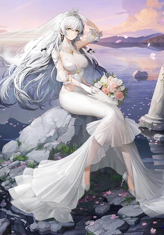 绯菟琥珀身着的婚纱与小栗帽的公主款式截然不同。相较于那厚重神圣的堆料设计,她身上的婚纱更显轻薄剔透。